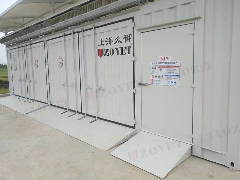 حاوية التخزين المؤقت للمواد الكيميائية الخطرة هي خيار موثوق آخر لتخزين المواد الكيميائية الخطرة.تم تصميم هذا الحاوية مع أجهزة رفع لسهولة تحميل وتفريغ ويمكن أيضا استيعاب دلو التراص للاستخدام المرن للمساحة الداخليةالحاوية لديها هيكل مضاد للانفجار وتحتوي على نظام تحكم درجة الحرارة، ونظام إطفاء الحريق التلقائي، ونظام تنقية، ونظام تهوية مضاد للانفجار،و جهاز مكافحة التسرببالإضافة إلى ذلك، يأتي مع المنحدر الصلب لسهولة الوصول.